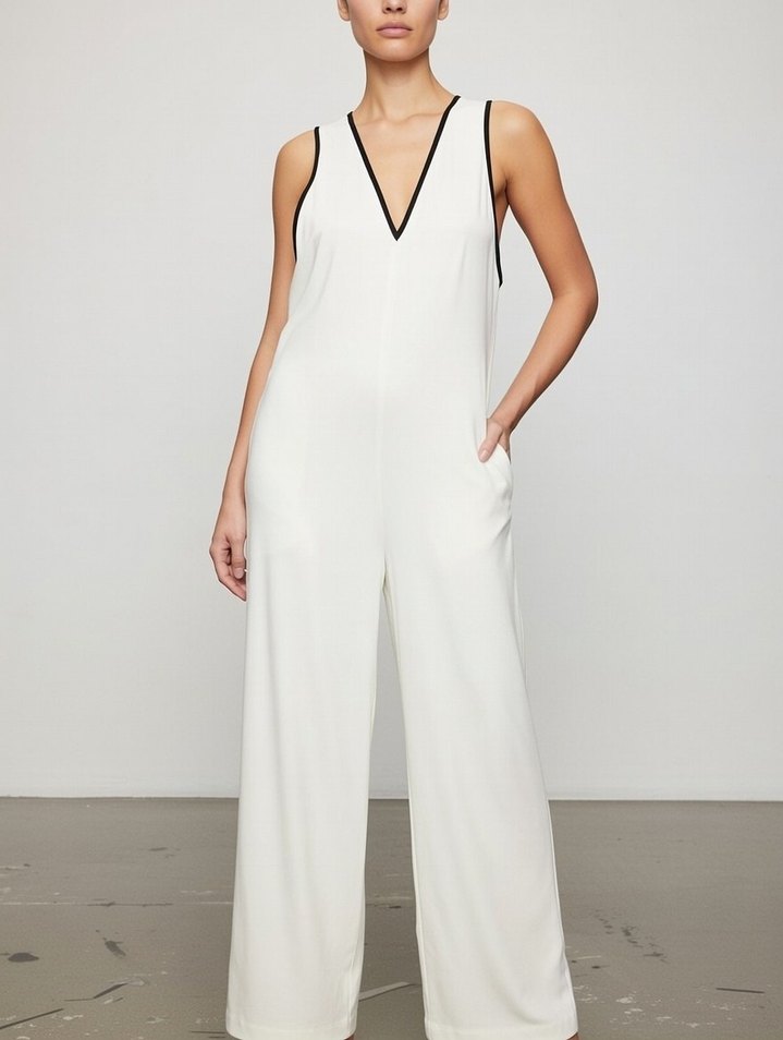 Beyaz renkli, V yakalı ve kolsuz kadın tulumu, uzun ve rahat kesimlidir. İpek gibi dokusuyla minimalist ve çağdaş stil sunar, ofis için uygundur. Rahat ve şık bir tasarıma sahiptir. ✨