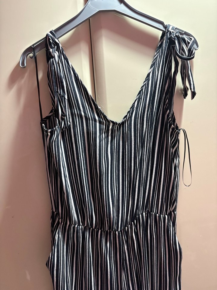 V yakalı, askılı çizgili mini tulum. mezuniyet fotoğraf çekiminde bir kez giydim midi boy rahat bir kumaşı var bol ve bir sıkıntısı yok koton marka