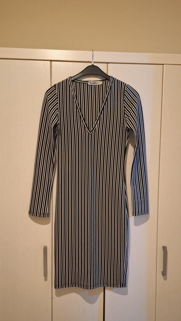 V yakalı, çizgili ve uzun kollu, vücuda oturan siyah beyaz elbise. Günlük kullanıma uygun.