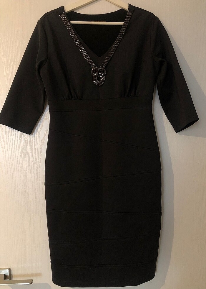 Çok az kullandım, takısı üzerinde v yakalı, ofis, davet kullanımı için çok uygun gri elbise, 38-40 bedene uyumlu
