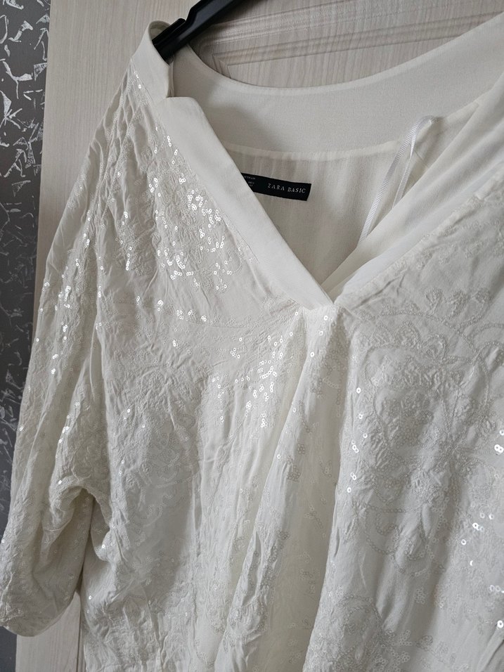 Dökümlü tasarıma ve V yakaya sahip, bol kesim beyaz pullu parlak, kollu ve normal midi boydadır, minimalist bohem tarzı için uygundur.