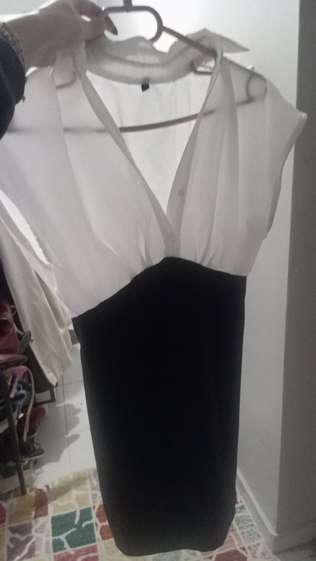 V yakalı, drapeli, kolsuz ve midi boyda, beyaz üst ve koyu renk etekli, şık ve fit bir elbisedir. Ofis veya sokak modasına uygun Paris tarzı.