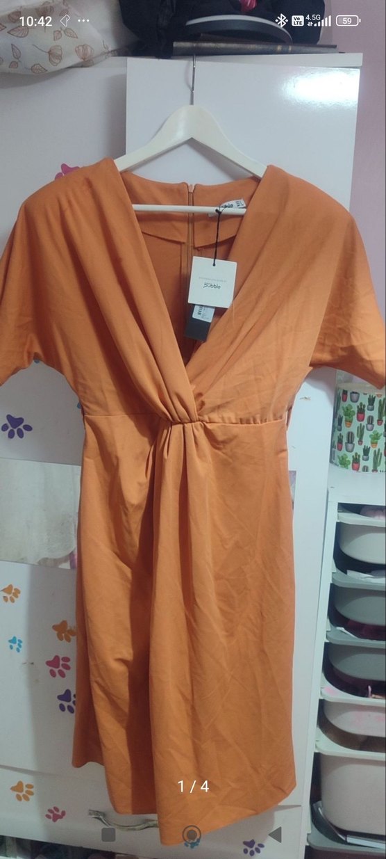 Bej renkli, V yakalı ve kısa kollu midi elbise. Drapeli ve vücuda oturan kesimiyle, sentetik kumaştan üretilmiştir.