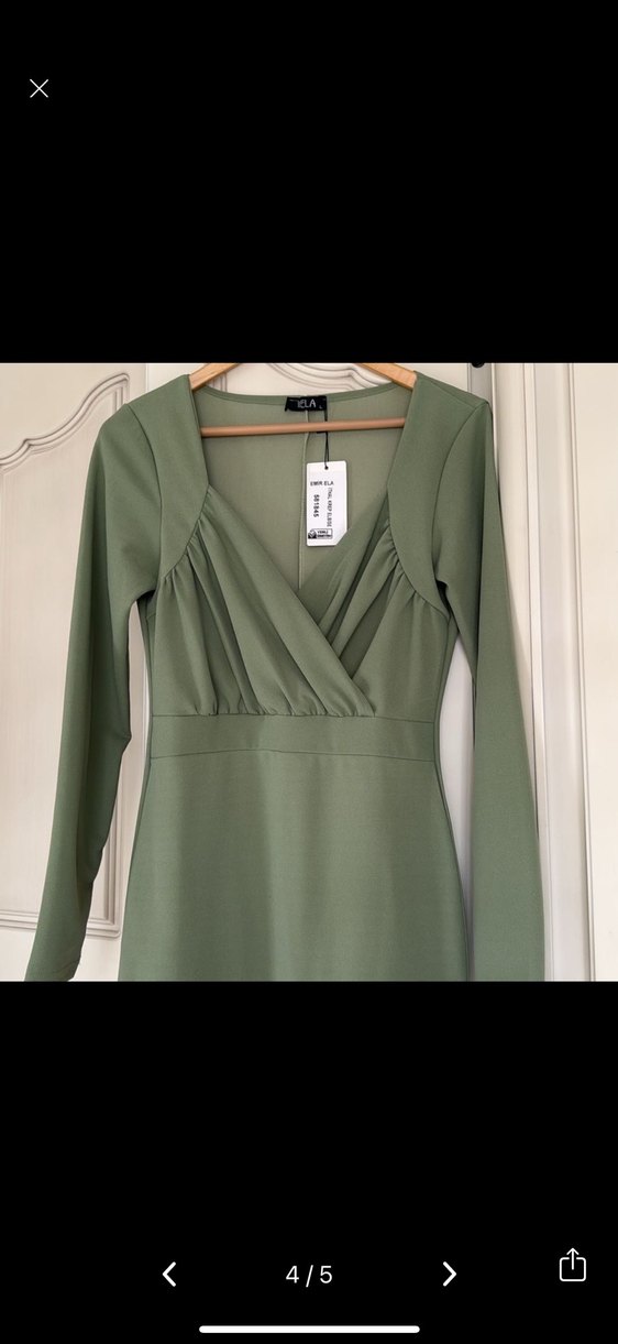 Haki renkli, V yakalı ve uzun kollu bu elbise, drapeli detaylara sahip ve düz dokulu sentetik kumaştan yapılmıştır. Ofis için uygundur.