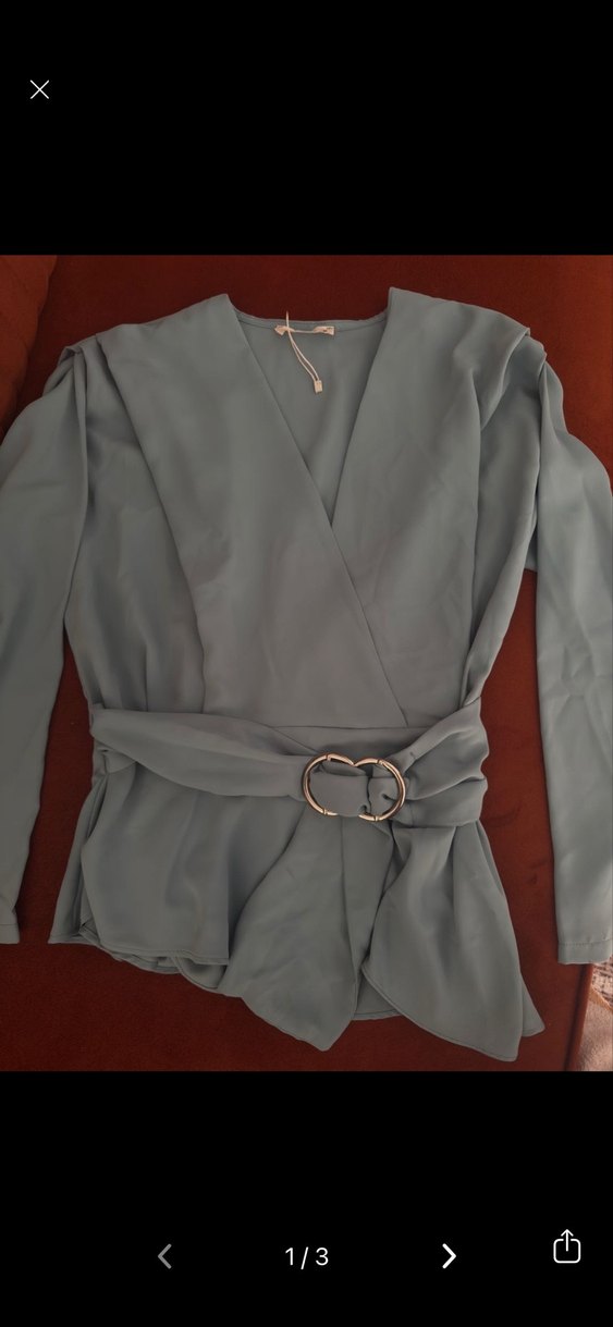 Turkuaz renkte, V yakalı, uzun kollu, kemerli ve bol kesim kısa uzunlukta kadın bluz. Pürüzsüz sentetik ipek kumaştan üretilmiştir, ofis için uygundur.