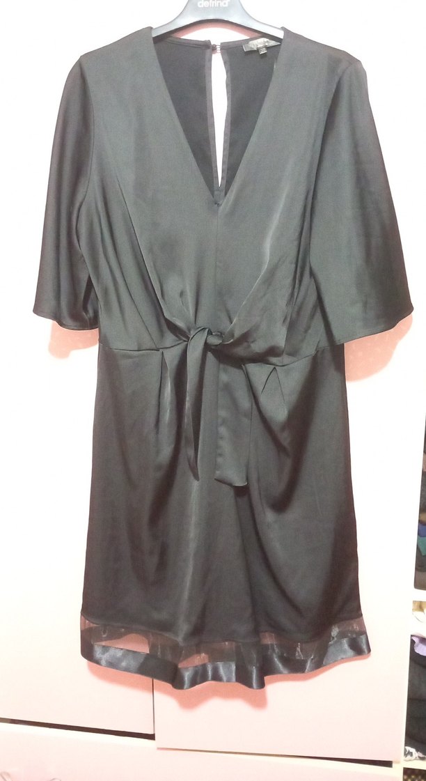 V yakalı, kemerli siyah midi elbise. Strappy kollu, bol kesim ve romantik akşamlar için uygun.