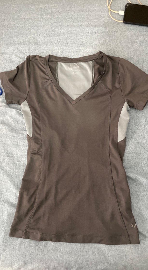 V yakalı, kısa kollu, bej renkte, vücuda oturan sentetik kumaştan yapılmış tişört. Rahat ve şık, günlük kullanıma uygun.