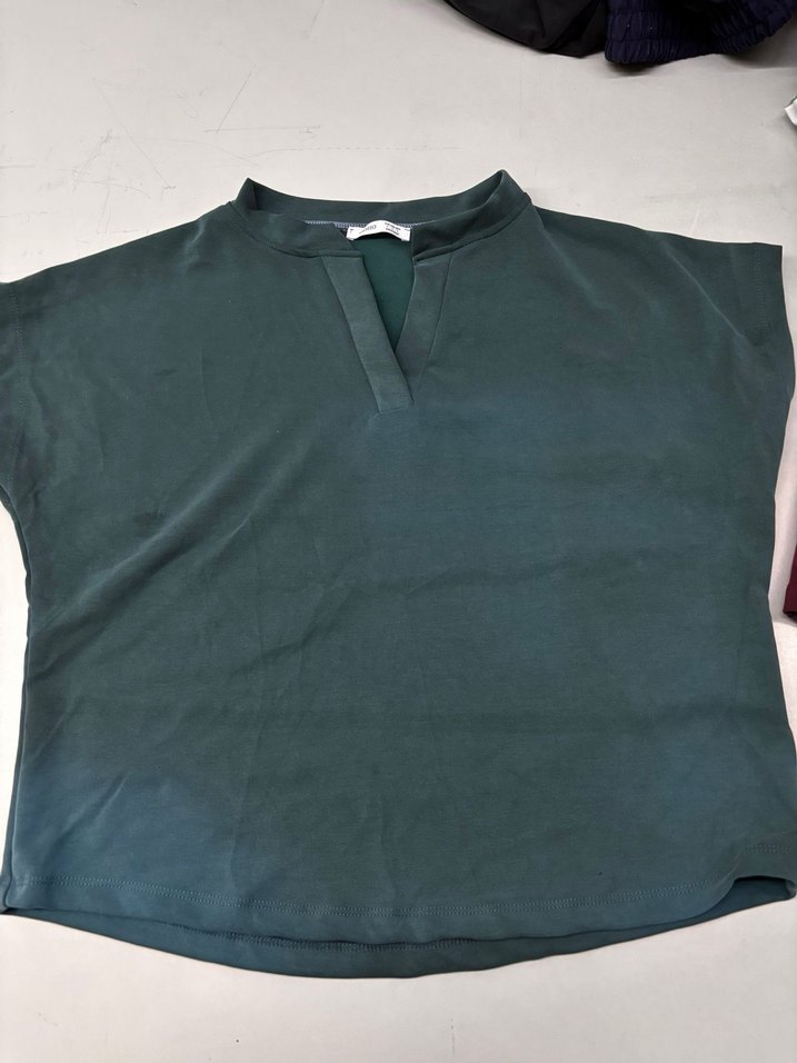 Koyu yeşil renkte, V yakalı ve kısa kollu, rahat kesim kadin bluz. Düz, sentetik kumaştan üretilmiş, günlük sokak stili için uygun.