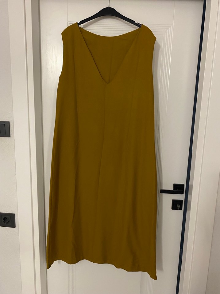 V yakalı, kolsuz midi elbise, bol kesim ve drapeli detaylara sahip. İpeksi kumaştan, koyu sarı renkte, günlük kullanım için uygun. hiç bir kusuru yoktur.az kullanıldı. 58 kilodan itibari kullanabilir.beline kemer takılıp kullanılabilir.acil satılıktır.