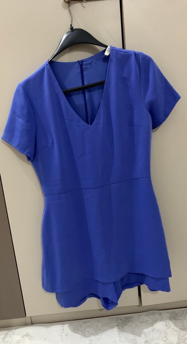 V yakalı, kısa kollu, mavi kadın şort tulum. İpeksi kumaştan, drapeli ve desen içermeyen sade tasarım, günlük sokak stili için uygun. ✨etiket yeri yırtık resimlerde vardır