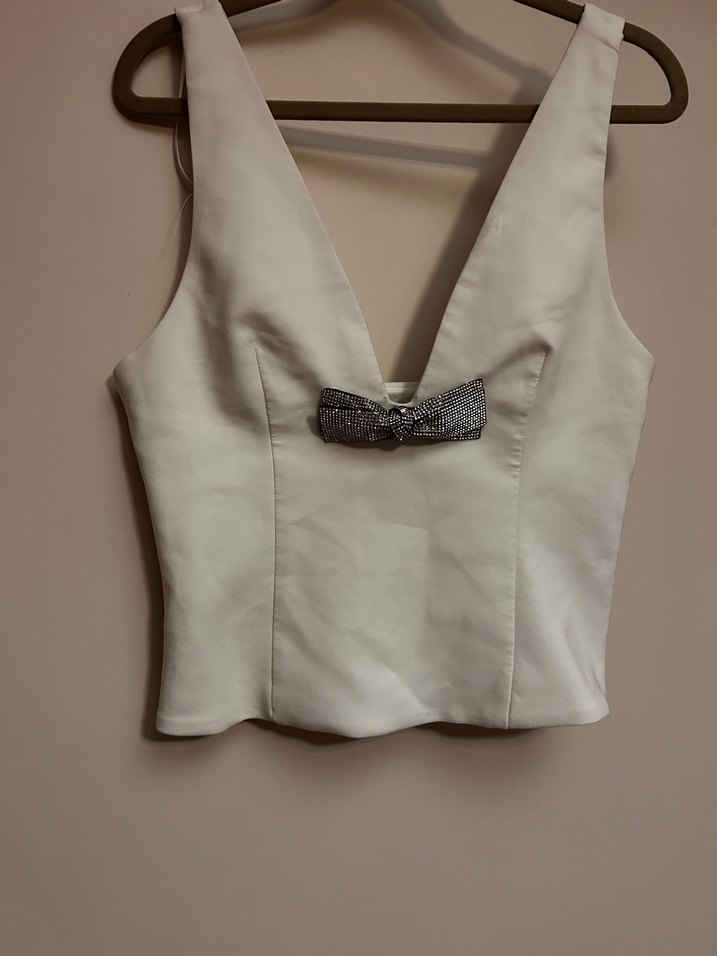 Derin V yakalı, düğmeli gri fiyonk detaylı, mini uzunlukta beyaz, vücuda oturan sentetik kumaş büstiyer.