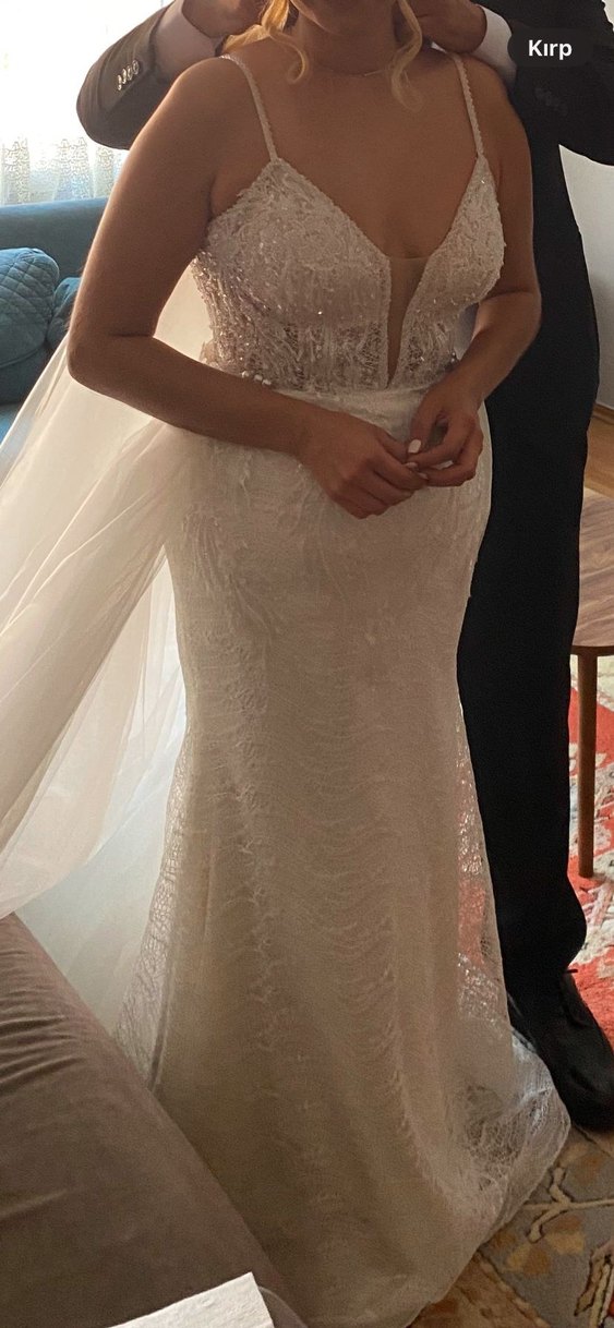 V yakalı, kolsuz, dar kesim A kesim gelinlik, uzun boy ve açık beyaz renkte modern klasik şıklık sunar.2. kısa gelinlik te fiyata dahildir