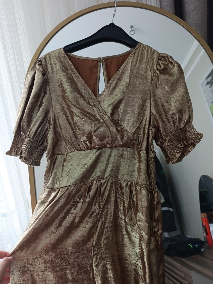 V yakalı, parlak gold tulum drapeli ve askılı kolludur. bol ve vintage bohem tarzındadır. Günlük kullanıma uygundur. #tulum #elbise
