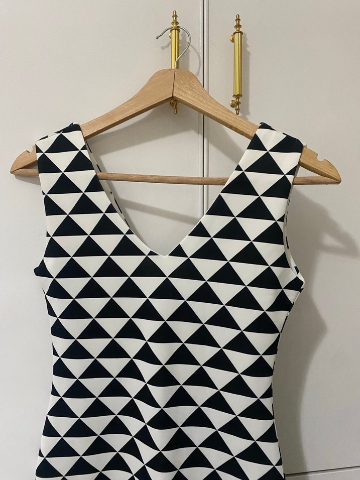 V yakalı, kolsuz, siyah beyaz geometrik desenli kadın atlet. Sentetik kumaştan, modern ve minimalist tarzda günlük kullanım için uygundur.