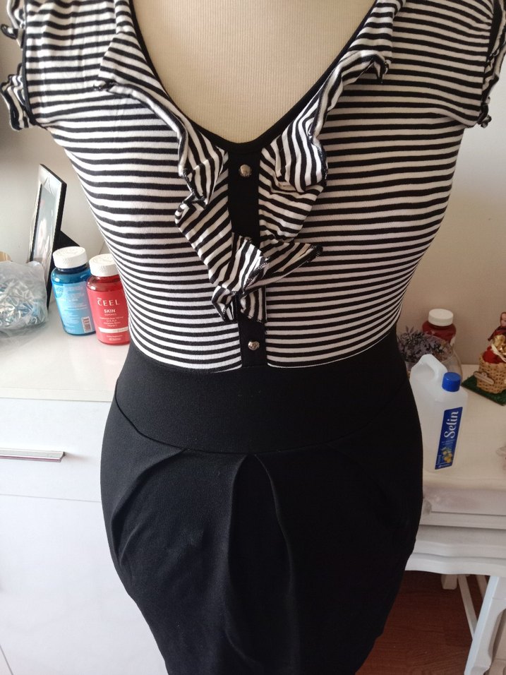 V yakalı, fırfırlı detaylı, askılı kollu, siyah çizgili, vücuda oturan midi boy elbise. Trendy günlük kullanım için uygun.