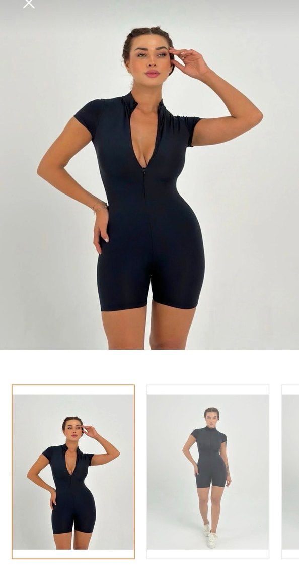 V yakalı, kısa kollu ve vücuda oturan siyah tulum, yumuşak sentetik kumaştan, sportif ve şık athleisure tarzında. Yeni etiketli.