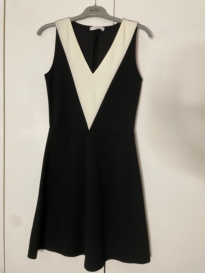 V yakalı, kolsuz siyah midi elbise. Fitted kesim ve pileli detaylarla ofis için şık bir seçenek.
