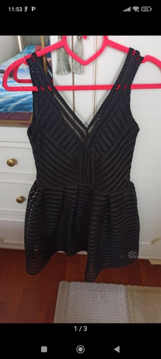 V yakalı, askılı ve pliseli tasarıma sahip siyah triko elbise, cesur ve gotik Paris tarzını yansıtır. Romantik akşamlar için uygundur.