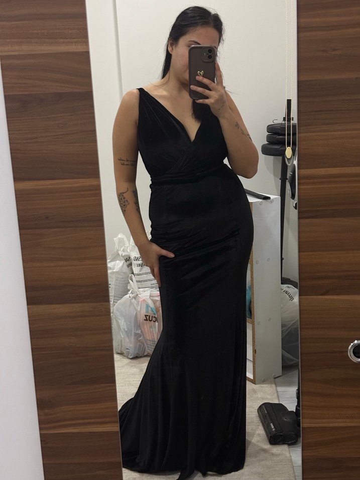 V yakalı, drapeli ve kolsuz siyah elbise, vücuda oturan kesimiyle romantik akşamlar için uygun. Gotik tarzda, midi boy ve desensizdir.