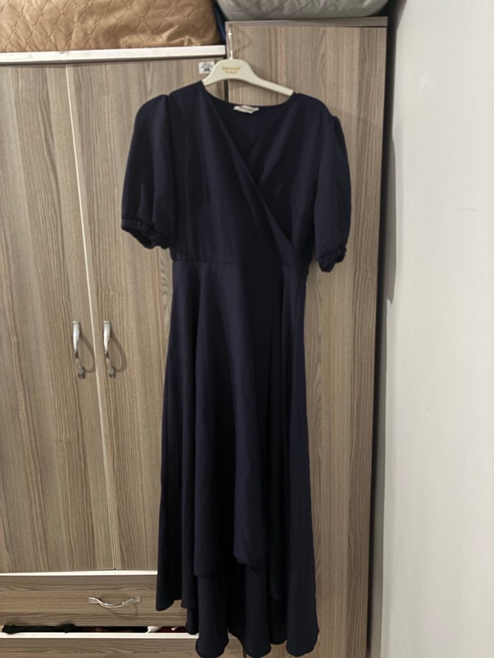 Siyah keten uzun elbise, V yakalı, drapeli ve bol kesimdir. Kısa kollu, minimal tarzda, ofis kullanımına uygundur.