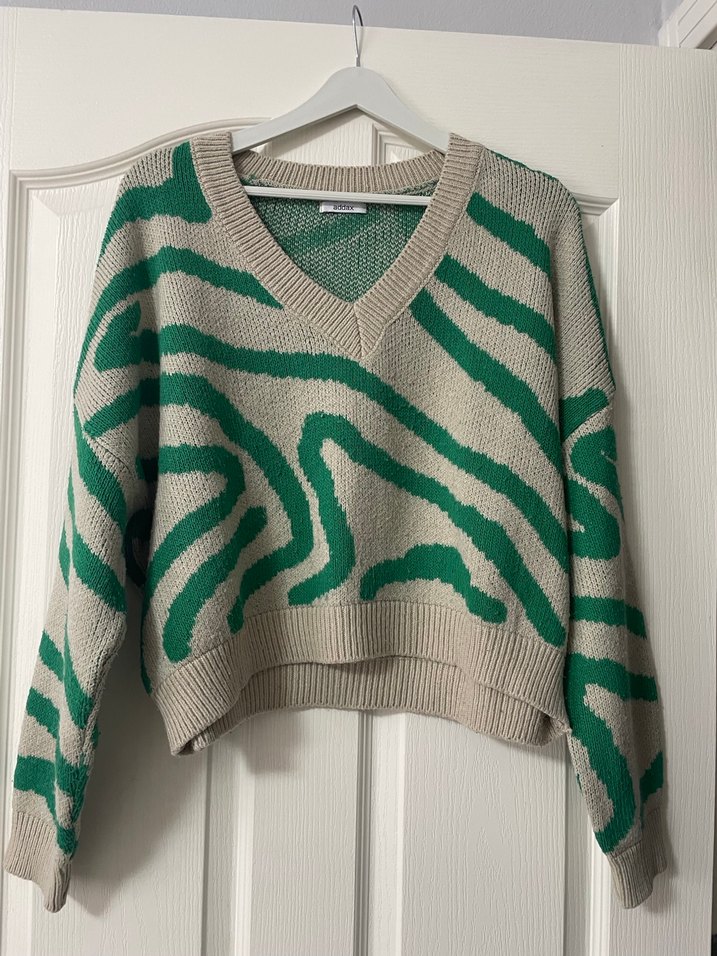 V yakalı, uzun kollu, rahat kesim triko kazak. Yumuşak örme kumaştan, günlük kullanıma