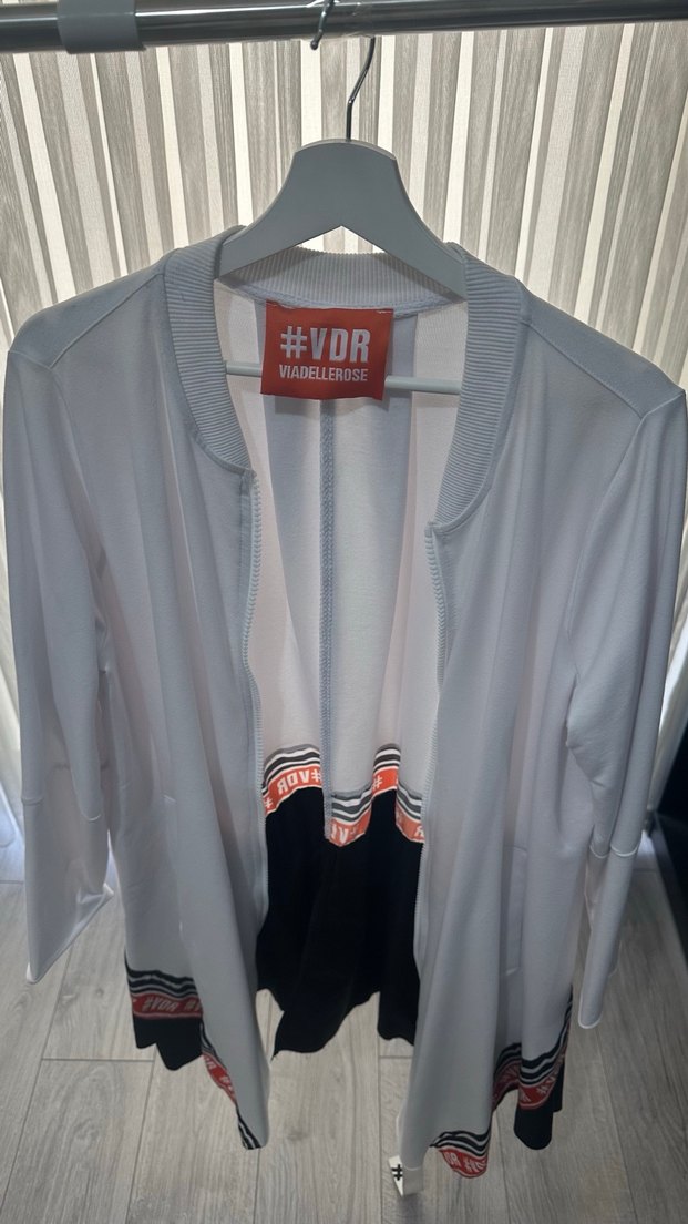 2 kere giydim V yakalı, bol kesim uzun beyaz kadın ceketi, baskılı detaylara sahip. Cırt cırtlı ve sentetik kumaştan, günlük sokak stili için uygun. #VDR, VIADELLEROSE