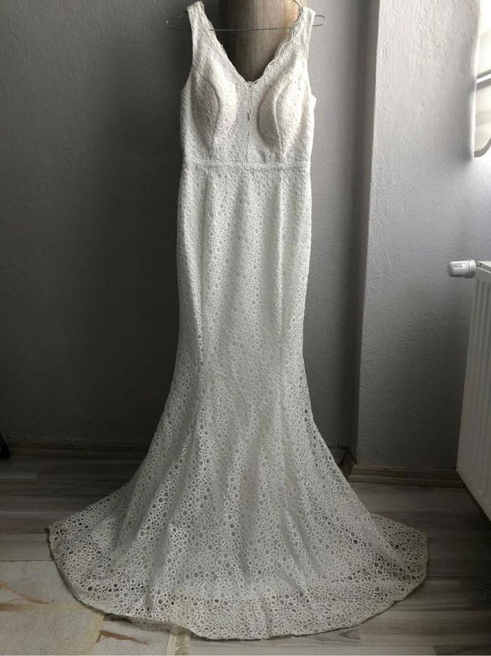 V yakalı, kolsuz, uzun ve vücuda oturan beyaz dantel balık elbise . Klasik ve minimalist bohem tarzını yansıtır, nikah vb için uygundur.