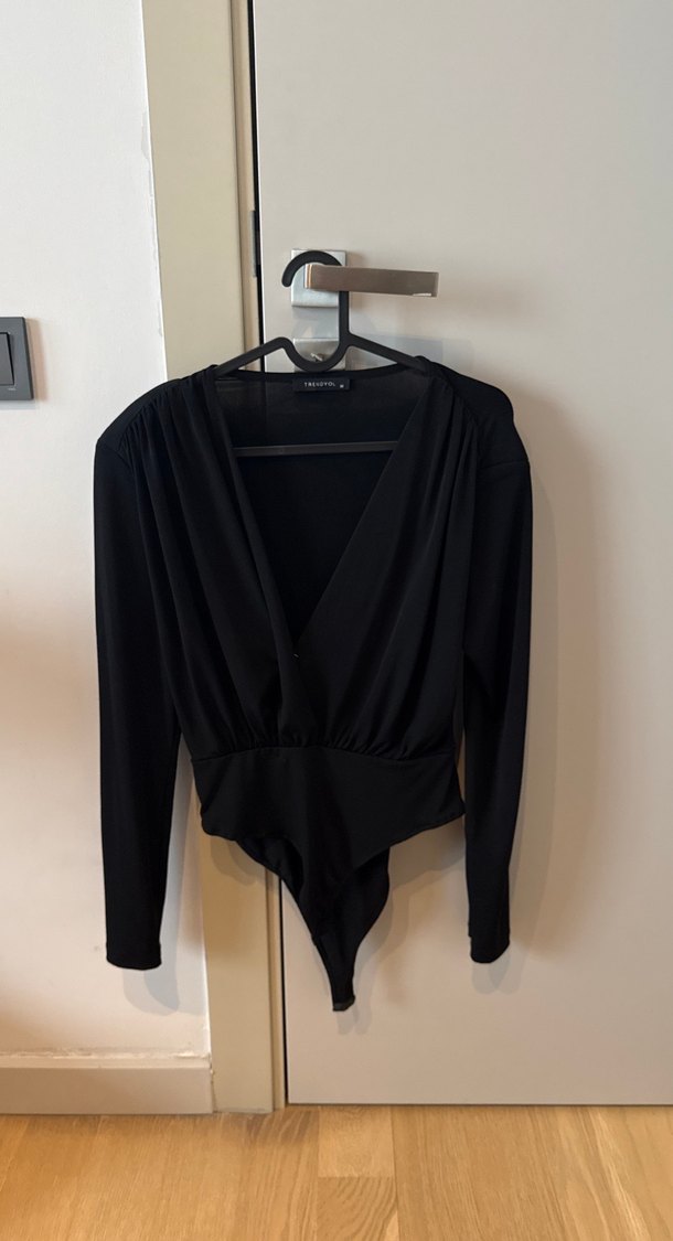 V yakalı, uzun kollu siyah bluz, drapeli ve vücuda oturan kesimiyle minimalist gotik tarzda cesur görünümler için uygundur. Yumuşak sentetik kumaştan üretilmiştir.