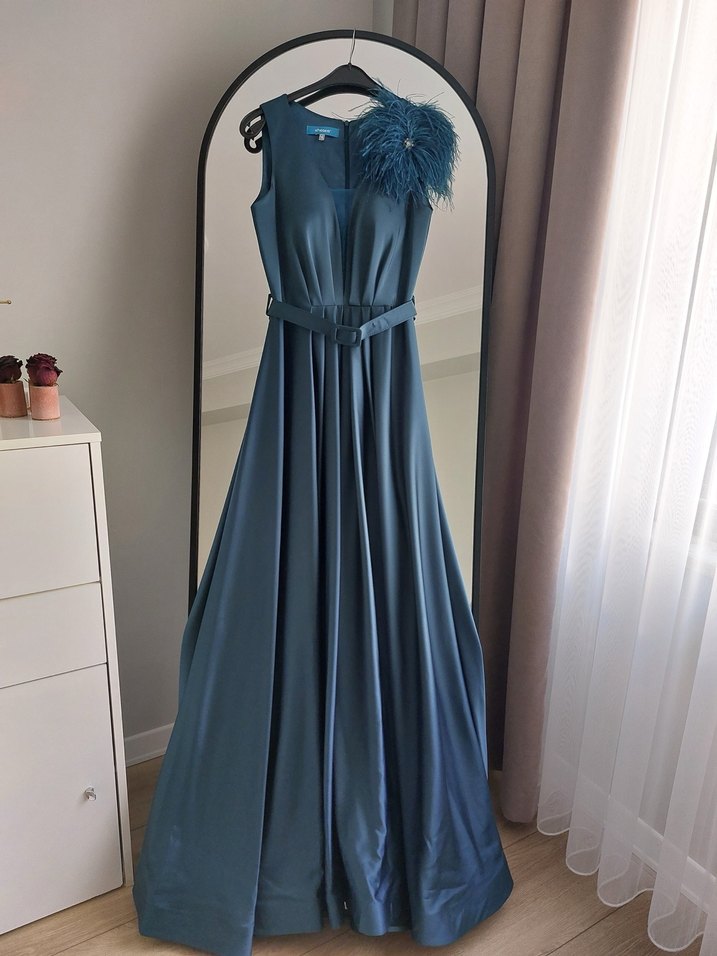 V yakalı, kürk detaylı omuz süslemeli, uzun ve fitted kesim mavi elbise. Modern klasik tarzda, baskılı desene sahip, parti için uygun. ✨