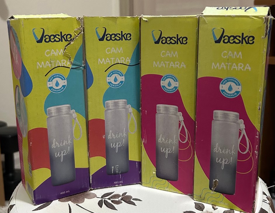 Vaeske cam matara, 480 ml kapasiteye sahip, haki ve gri renklerde. Askı aparatı yoktur. 4 adet mevcuttur ve toplu satılmaktadır.