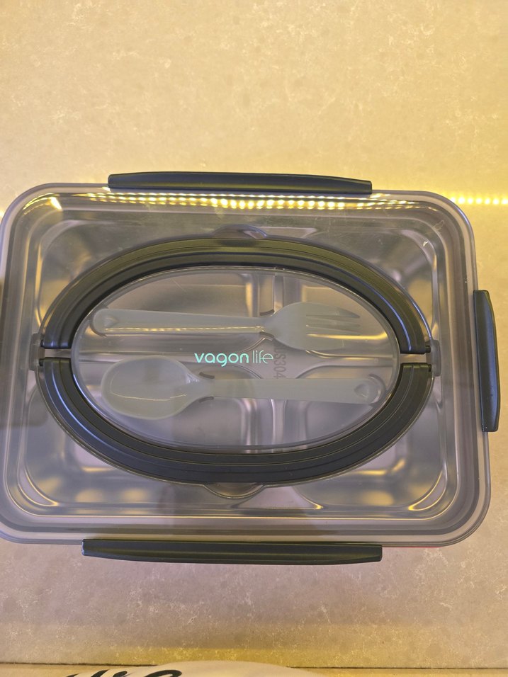 Kırmızı çelik saklama kabı, kilitli kapak ve içinde çatal kaşık seti ile kullanım kolaylığı sağlar. sadece bir kez kullanıldı ölçüleri fotoğrafta belirttim iade yoktur