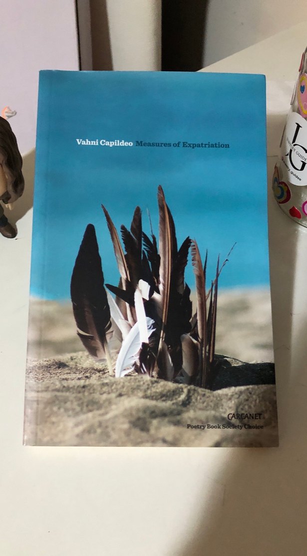Vahni Capildeo'nun "Measures of Expatriation" adlı şiir kitabı, kum üzerinde duran tüylerle ve açık mavi gökyüzüyle kaplanmıştır. İngilizce raf no 1