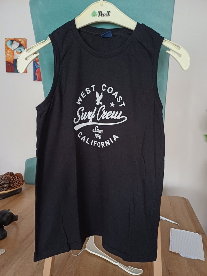 Vaikiki..Siyah renkli, pamuklu, kolsuz ve bol kesim erkek çocuk tişörtü. Önünde baskılı grafik ve yuvarlak yakası vardır. ♂️ omuzdan boy 60cm..iki kol arası 50cm huzurla iyi günlerde kullanın