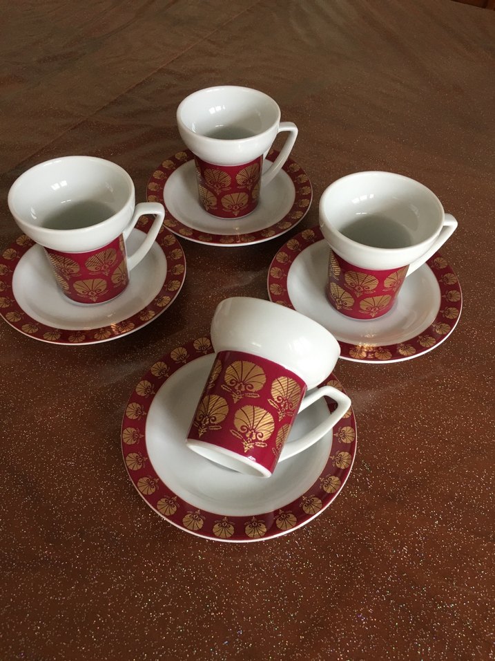 Bordo renginde, altın desenli 4 kahve fincanı ve tabaklardan oluşan set. Espresso veya Türk kahvesi için uygundur. ☕ 2li olarak 800 tl, 4lü olarak 1500 tl satılacaktır. Acilen taşındığımız için hızlıca bazı mutfak eşyalarımızı satıyoruz. Ve yine taşındığımız için zaten koli yapıyoruz, ona göre çok özenli sarıp göndereceğiz.