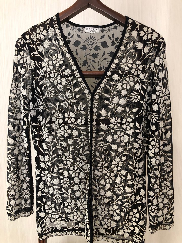Dantel ve işlemeli çiçek desenlerine sahip, v yaka ve uzun kollu sadece 1 kere kullanıldı üzeri boncuk işlemeli