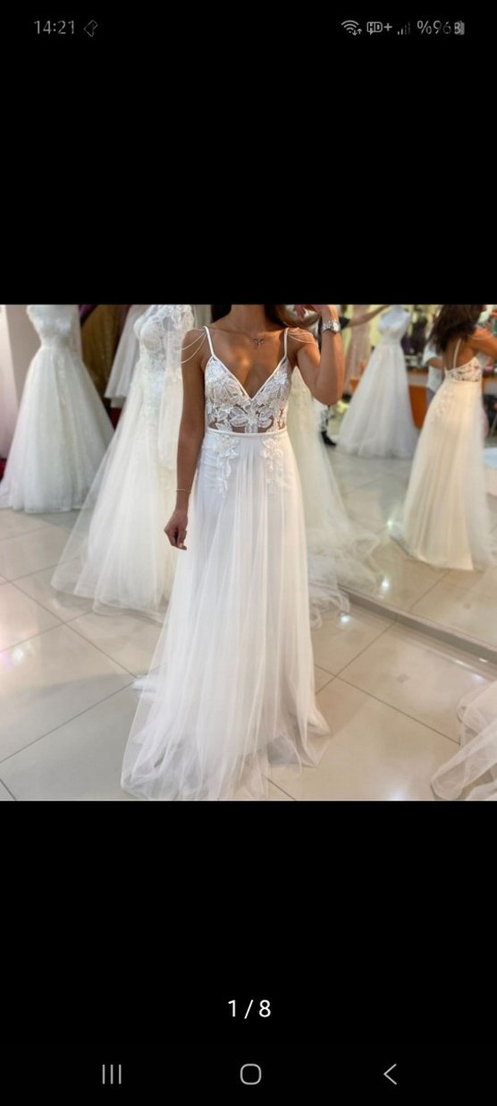 Bu beyaz, vücuda oturan A kesim gelinlik, ince askılı straplez yaka ve bohem tarzı detaylara sahiptir. Dantel işlemeli üst kısmı ve uzun, akışkan eteğiyle dikkat çeker.