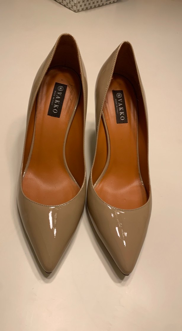 Vakko markasına ait, ofis kullanımı için uygun, bej renkli, rugan görünümlü, modern klasik stiletto topuklu kadın ayakkabısı.