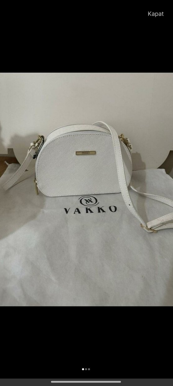 Vakko marka beyaz deri kadın çanta, kemerli tasarım ve yılan derisi desenine sahiptir, klasik şıklık ve sokak modasına uygundur.