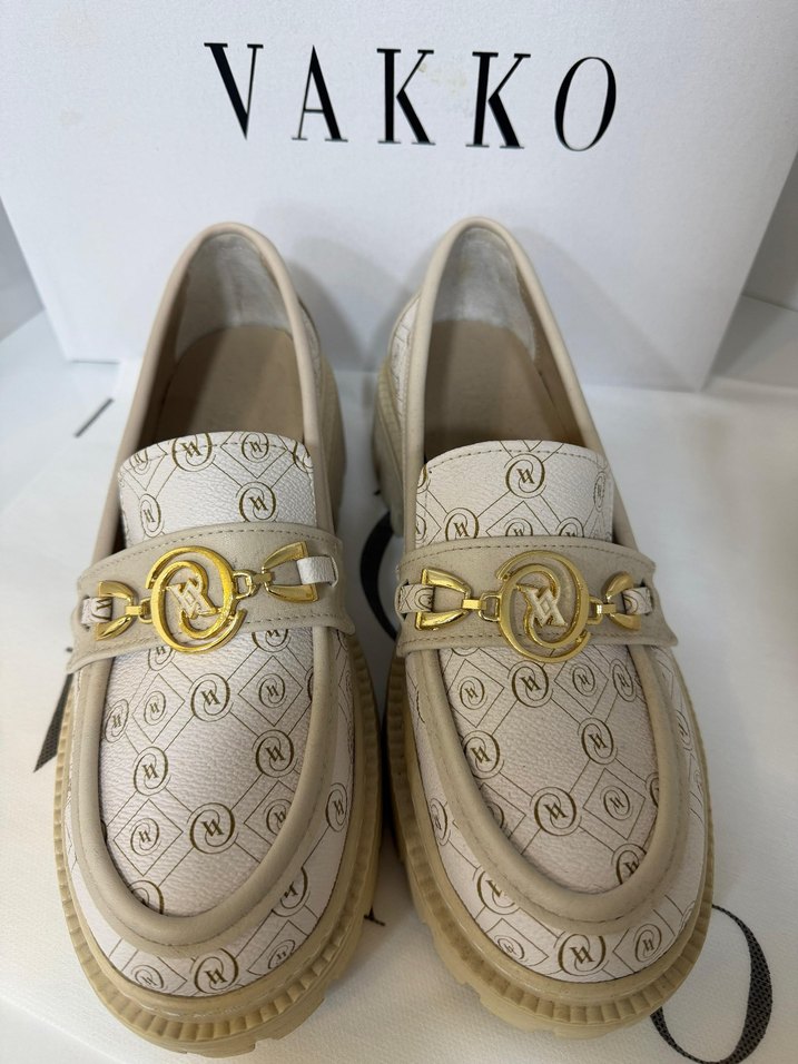 Vakko markasına ait beyaz renkli, yılan deseni detaylı, blok topuklu ve tokalı kadın loafer ayakkabı. Dayanıklı kauçuk malzemeden üretilmiştir.