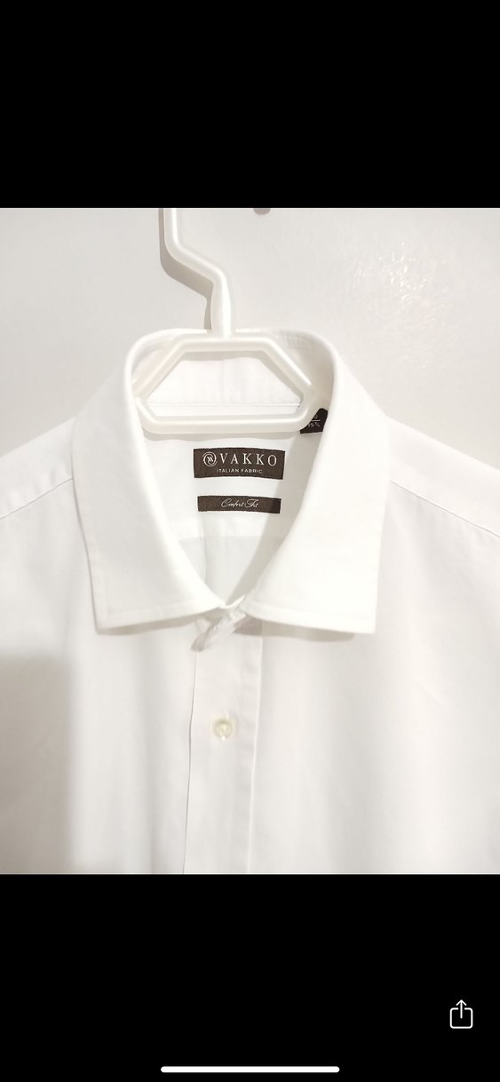 VAKKO etiketli, parlak sentetik kumaştan, kısa kollu, yakalı ve düğmeli beyaz erkek gömleği. Regular fit ve desensiz, ofis ve günlük kullanıma uygun. Genişlik 55 cm
