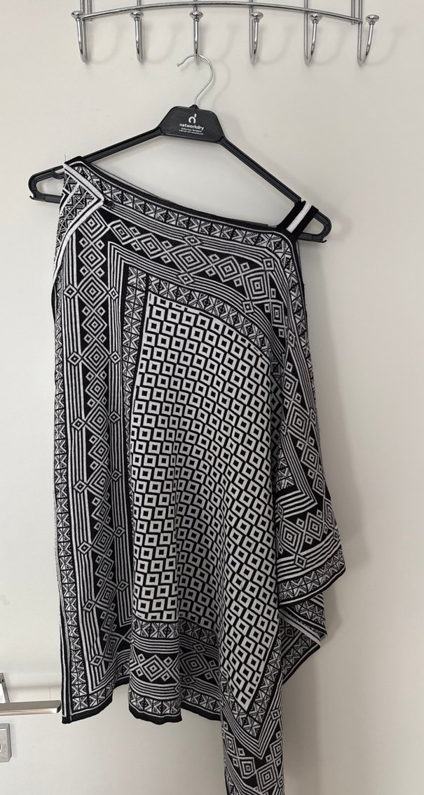 Gri desenli, drapeli, kolsuz ve salaş kesim kadın panço. Bohem tarzıyla günlük kullanım için uygundur. Tekne yaka detayına sahiptir.