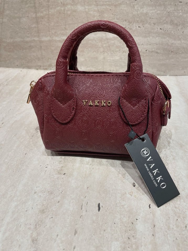Vakko markalı bordo deri kadın çanta, baskılı deseni ve tokalı detaylarıyla modern klasik tarz sunar. Çanta küçüktür