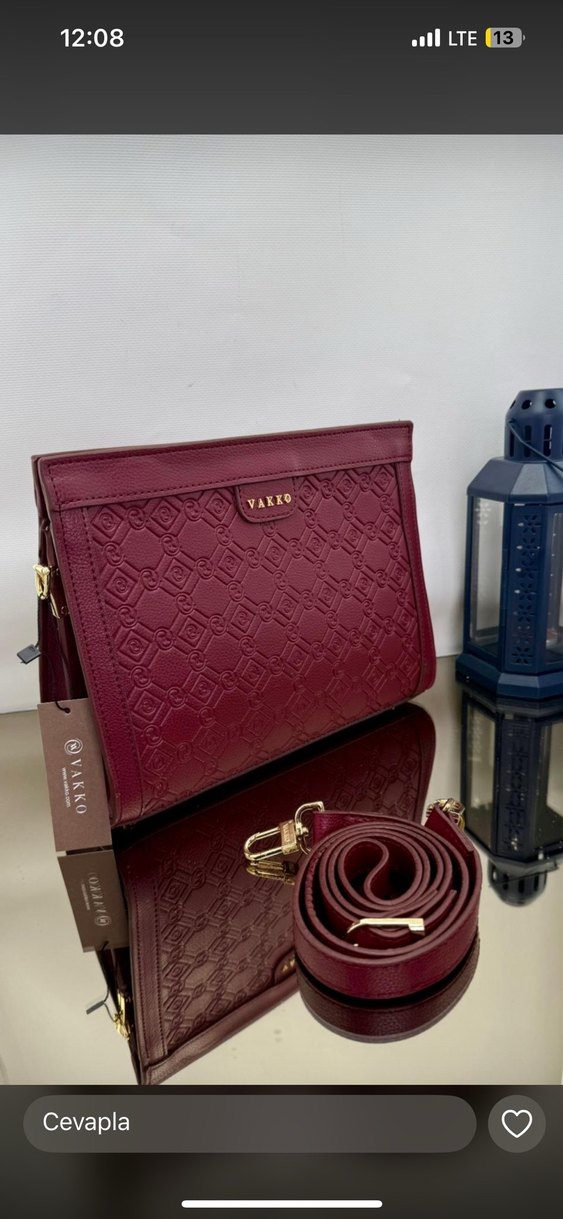 Vakko imzalı bordo deri çanta, modern klasik stilde, baskılı desenli ve kemerli detaylıdır, günlük kullanıma uygundur.