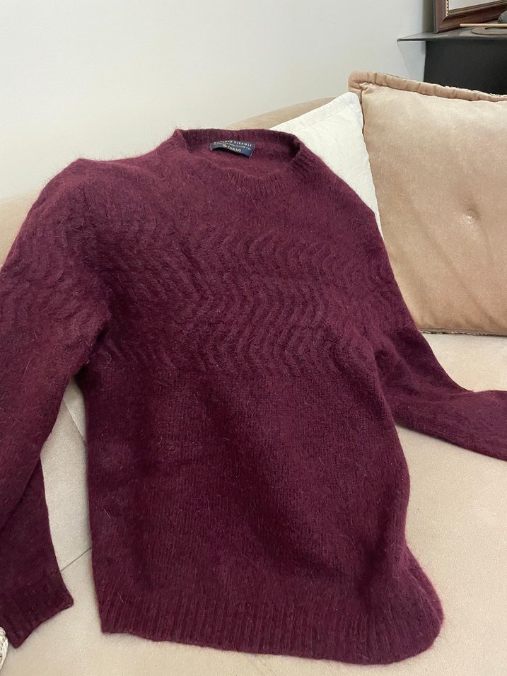 Bordo renkli, yün örgü kadın kazak, yuvarlak yaka ve uzun kolludur. Rahat kesimi ve normal boyu ile günlük kullanıma uygundur.