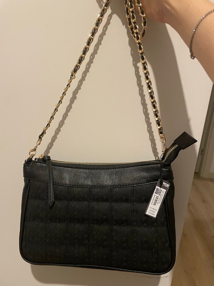 Zincir askılı, logo desenli siyah deri çanta. Hiç kullanılmadı etiketi ile duruyor yepyeni ve kusuru yok.