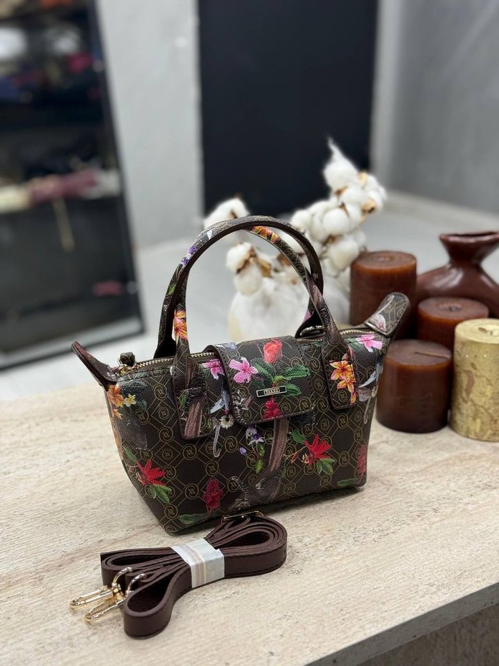 Koyu kahverengi deri çanta, çiçek desenli ve tokalı kapaklıdır. Bohem tarzıyla günlük kullanıma uygundur, saplı ve çıkarılabilir askısı vardır.