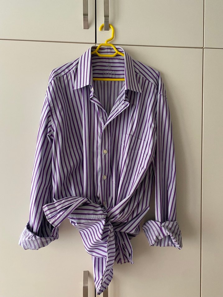 Mor çizgili, yakalı ve düğmeli gömleği. Uzun kollu, normal kesim ve sentetik kumaştan günlük rahat kullanım için uygundur.