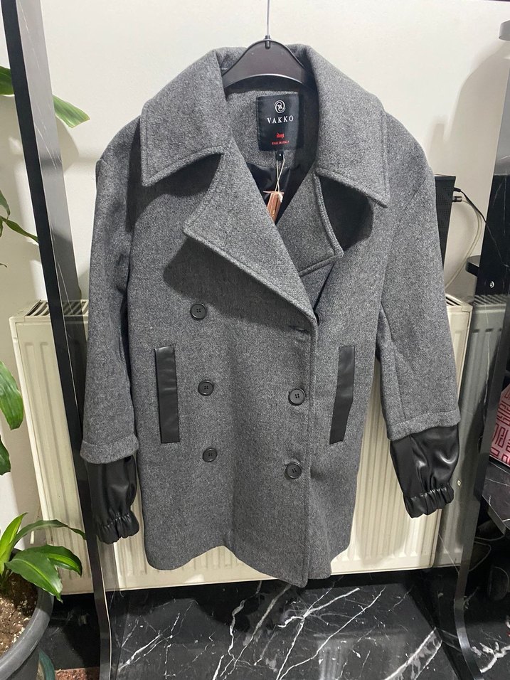 Vakko marka, çift düğmeli gri kaban, deri detaylı kollar ve ceplerle şık ve sıcak tutar. A kalite