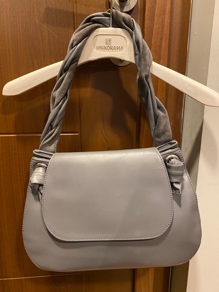 Gri süet malzemeden tokalı ve örgülü saplı kadın çantası, modern klasik tarzı Paris şıklığıyla buluşturur.