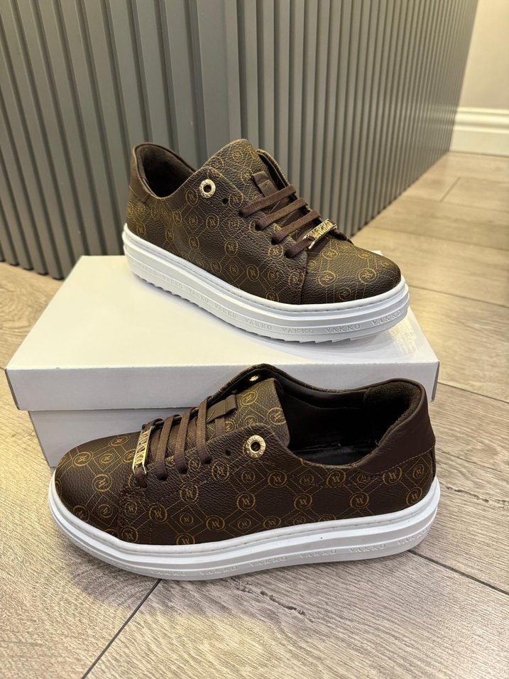 Kahverengi, parlak yılan desenli, bağcıklı ve platform tabanlı spor ayakkabılar, sokak stili için uygundur. İthal